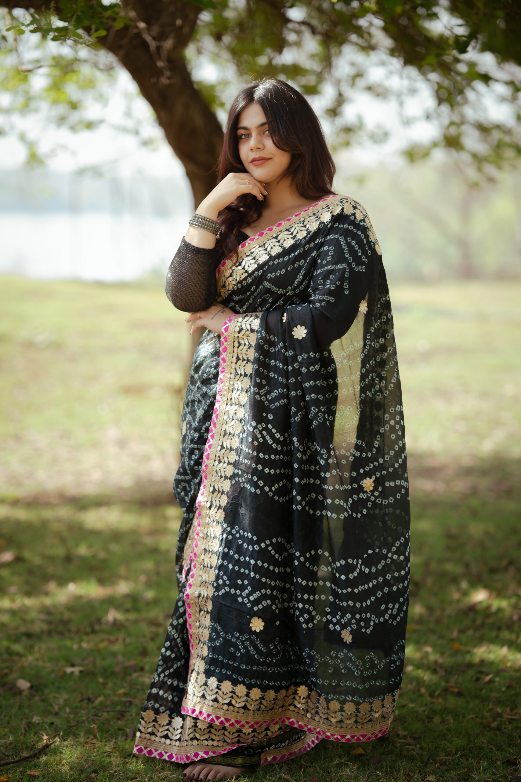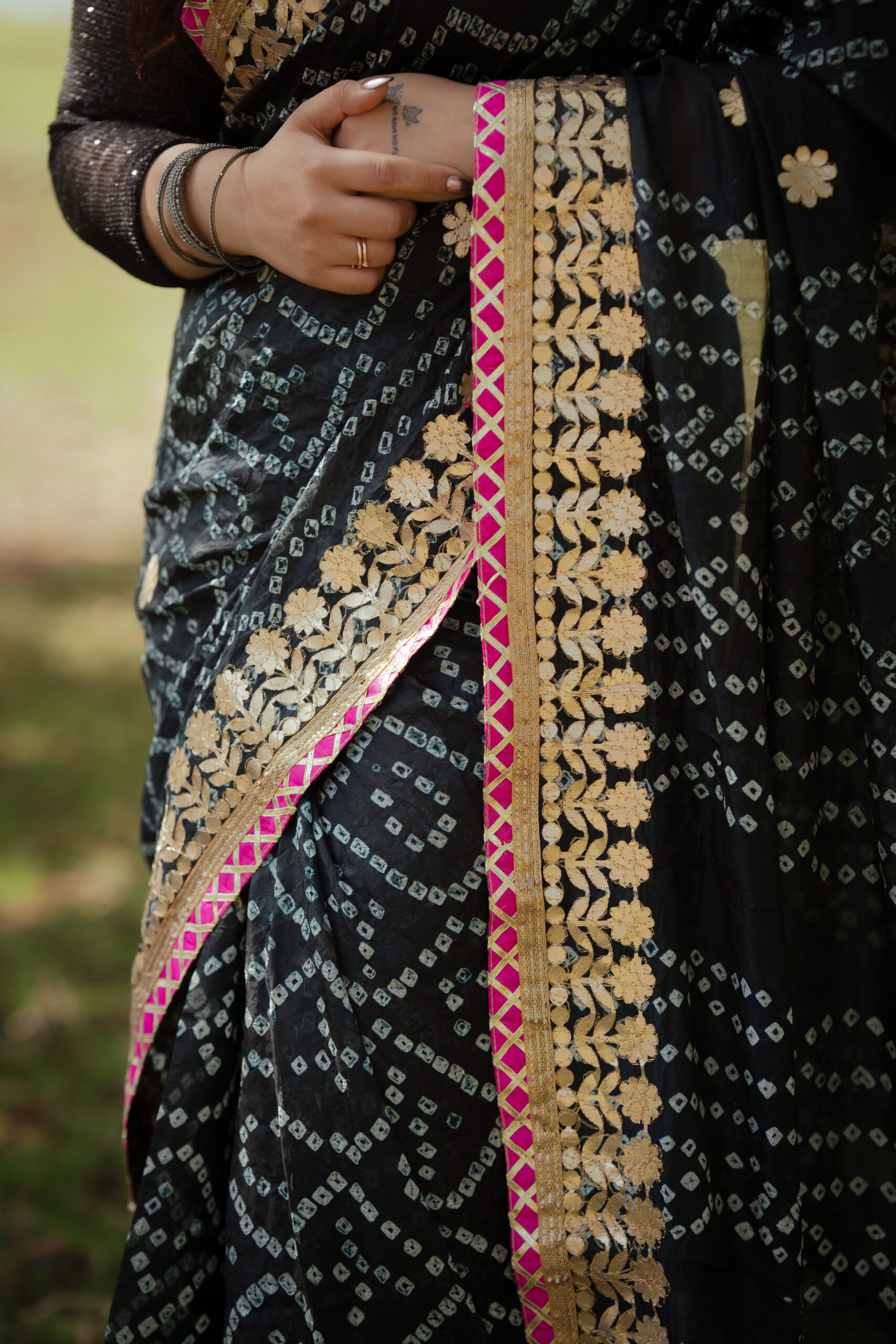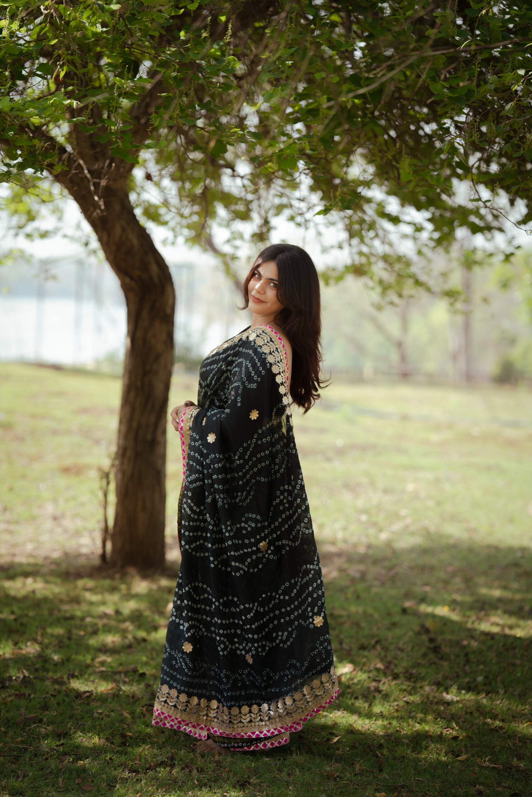 Be the first to review “Beautiful black color Rajasthani bandhani print saree with gottapatti work along with blouse piece